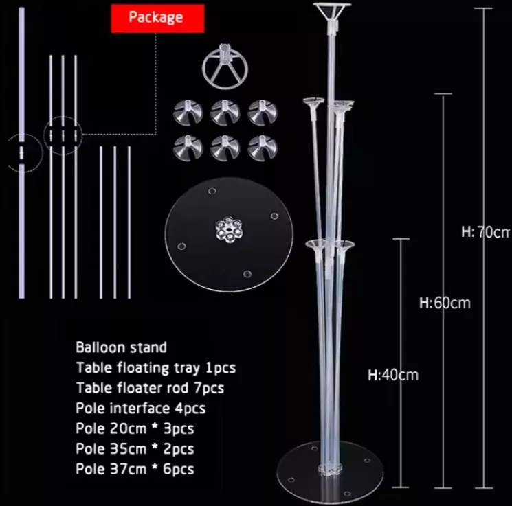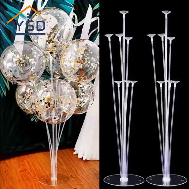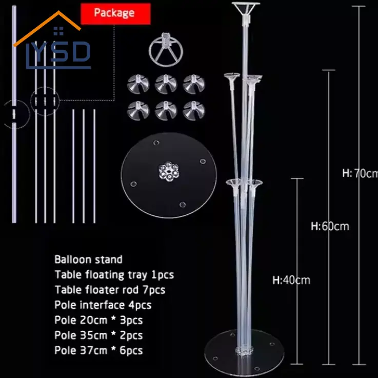 Il supporto per palloncini è generalmente trasparente. I palloncini ammucchiati insieme tendono a sembrare rigidi. Il supporto per palloncini trasparenti di YSD non è solo un'altezza. Ci sono lunghezze diverse in un set di supporto per palloncini. Ad esempio, il migliore che vendiamo è una combinazione di 70 cm, 60 cm e 40 cm. C'è un 70 cm, 3 60 cm e 3 40 cm. Sono combinati con palloncini per rendere i palloncini sparsi e ordinati. Questo effetto "sfalsato" si ottiene interamente da questi stand trasparenti di diverse lunghezze.