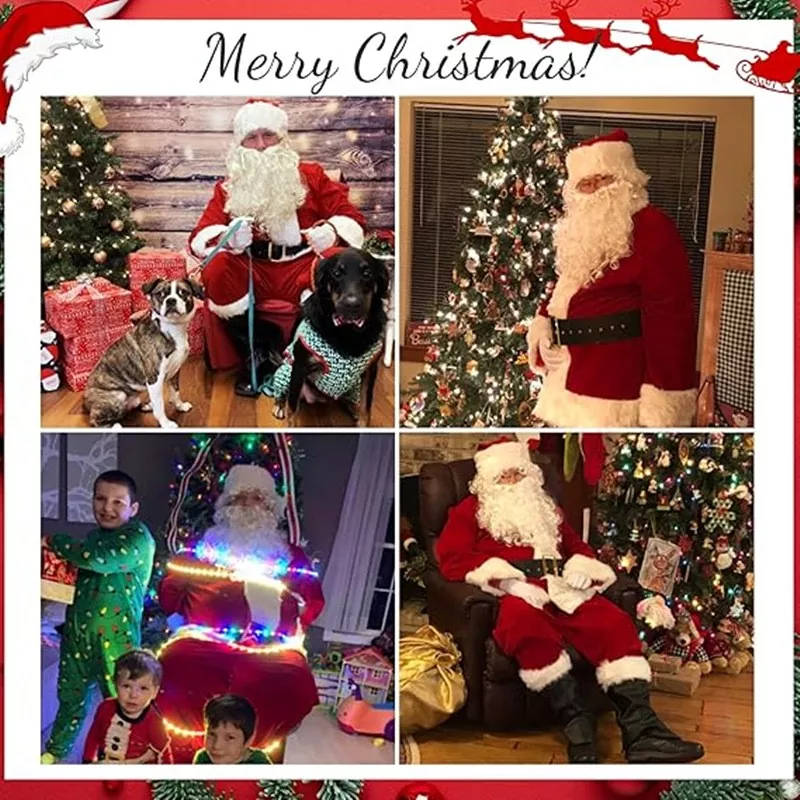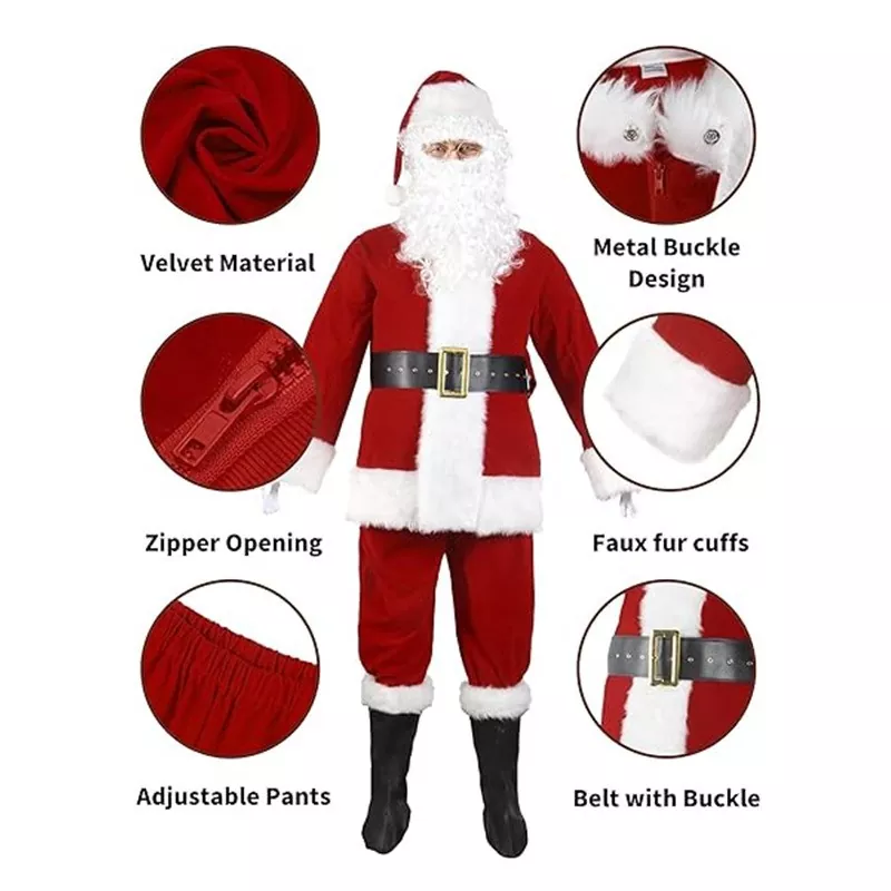 Questo costume da Babbo Natale è realizzato in tessuto in poliestere morbido e confortevole, offre un'eccellente traspirabilità e calore, garantendo calore e comfort durante le attività invernali. Il design del costume conserva la classica combinazione di colori rosso e bianco, accentata da soffici orli bianchi e una cintura nera, creando un impatto visivo sorprendente con dettagli intricati. Il costume è inoltre dotato di un cappello e della barba abbinati, rendendo facile da indossare senza accessori aggiuntivi.